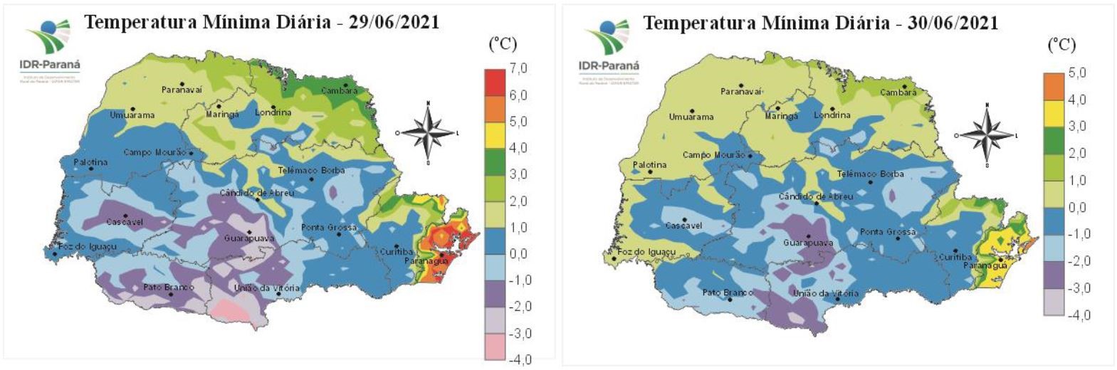 Figura 1. Temperaturas mínimas registradas em 29 e 30 de junho de 2021 no Estado do Paraná. Fonte: IDR-Paraná.