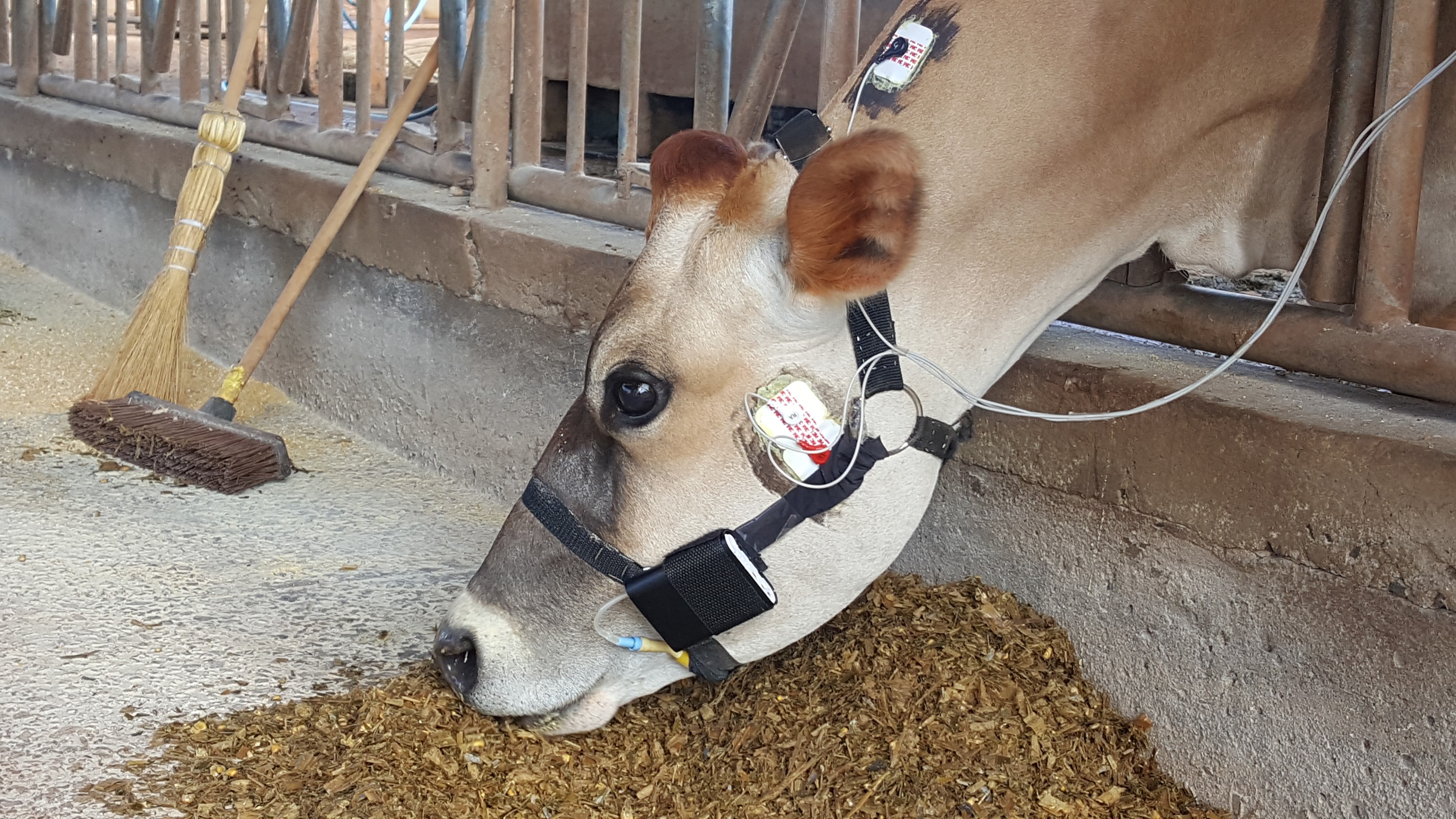 Formado por um conjunto de sensores de movimento, pressão e eletromiografia (detecta sinais elétricos originados na musculatura), o equipamento é posicionado de forma a monitorar os movimentos da mandíbula dos animais.
