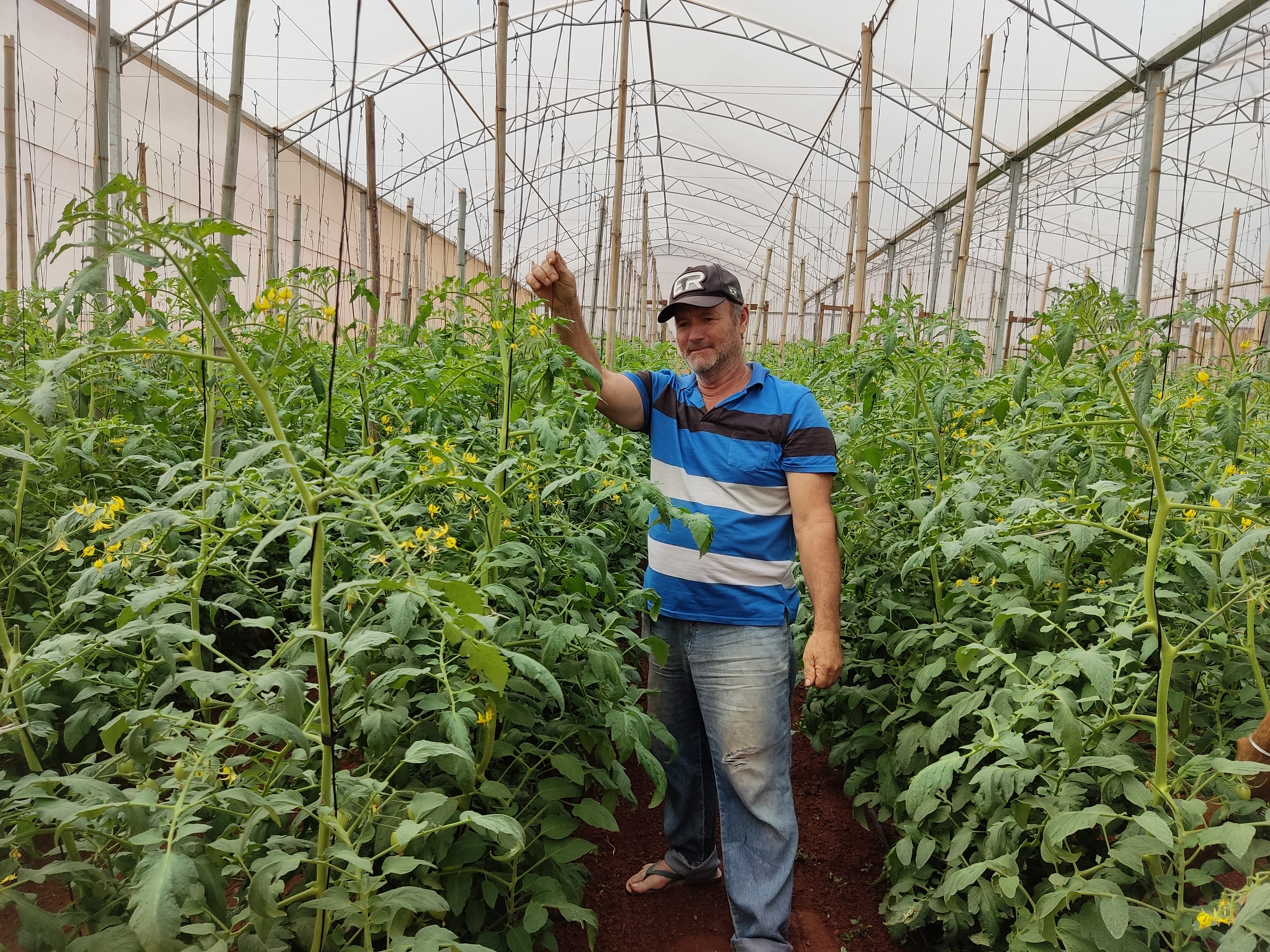 As plantas tiveram de ser conduzidas com duas hastes, amarradas em fitilhos de plástico até o arame superior da estufa, fixado a 3,5 metros de altura. O peso excessivo dos tomateiros exigiu, inclusive, o reforço da estrutura da estufa com bambus instalados a cada três metros.