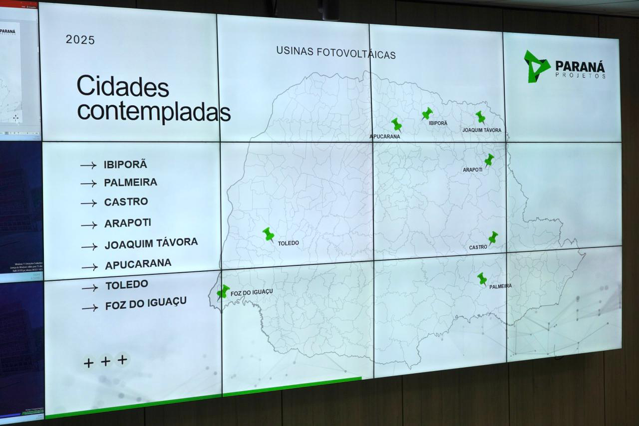 As usinas serão instaladas em terrenos do Estado, estrategicamente distribuídos nos municípios de Ibiporã, Castro, Palmeira, Arapoti, Joaquim Távora, Apucarana, Toledo e Foz do Iguaçu. Cada planta ocupará uma área aproximada de 35.000 m², o que equivale a cerca de cinco campos de futebol, e contará com infraestrutura moderna, sistemas de monitoramento remoto e dispositivos de eficiência energética, como inversores de alta performance e painéis de última geração.